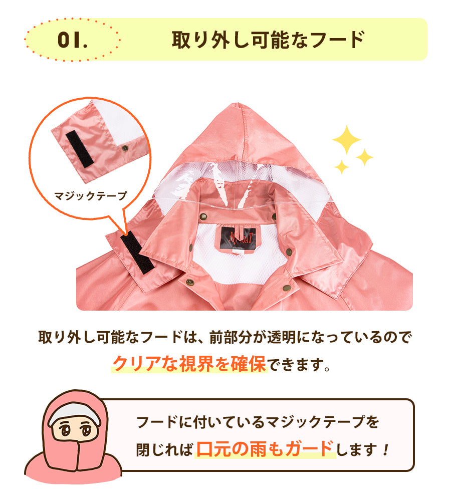 取り外し可能なフードは前部分が透明になっているので視界を妨げません。