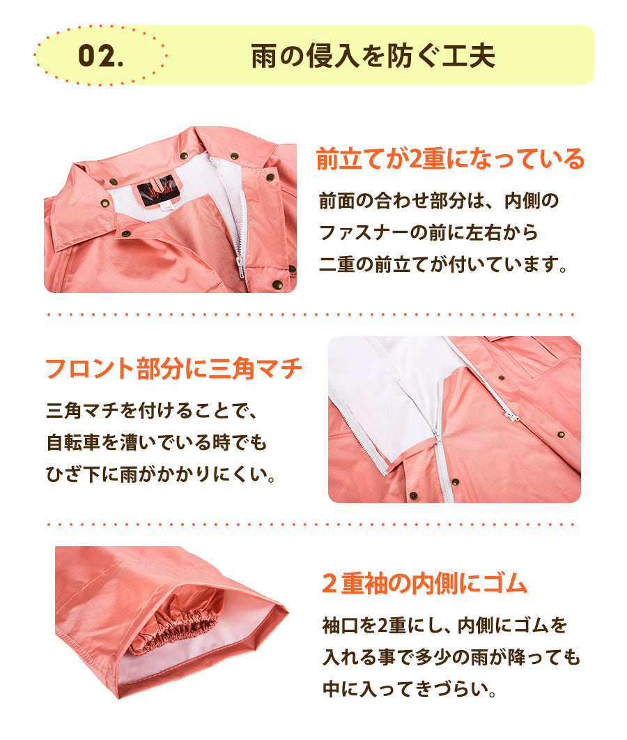前面のあわせ部分には、内側のファスナーの前に左右からの二重の前立てが付いています。この三角マチがあることにより自転車のペダルがこぎやすくなり雨の侵入も防ぎます。
