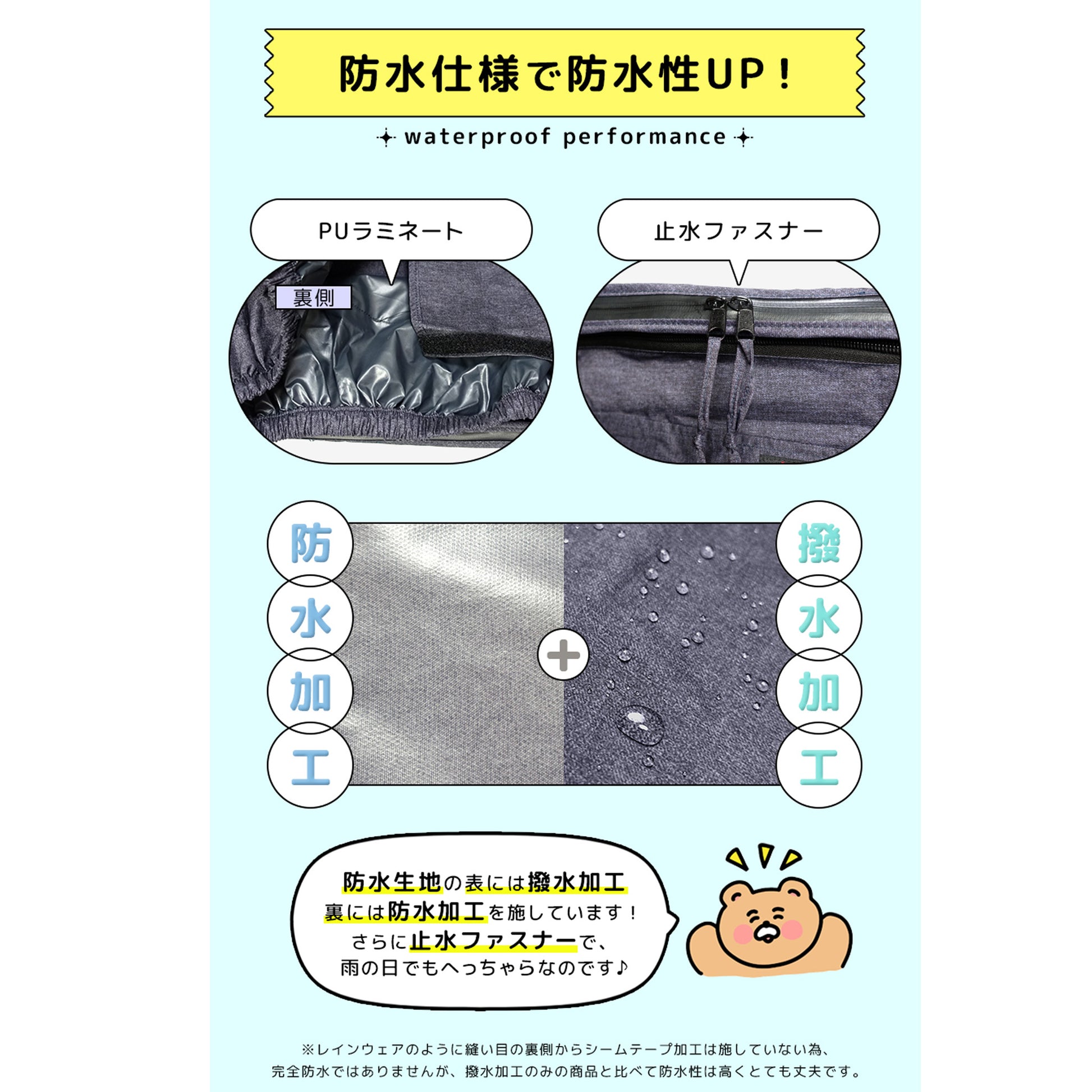 防水生地を使用しているので撥水だけのものより丈夫で長持ち!防水仕様なので雨から荷物を守ります。