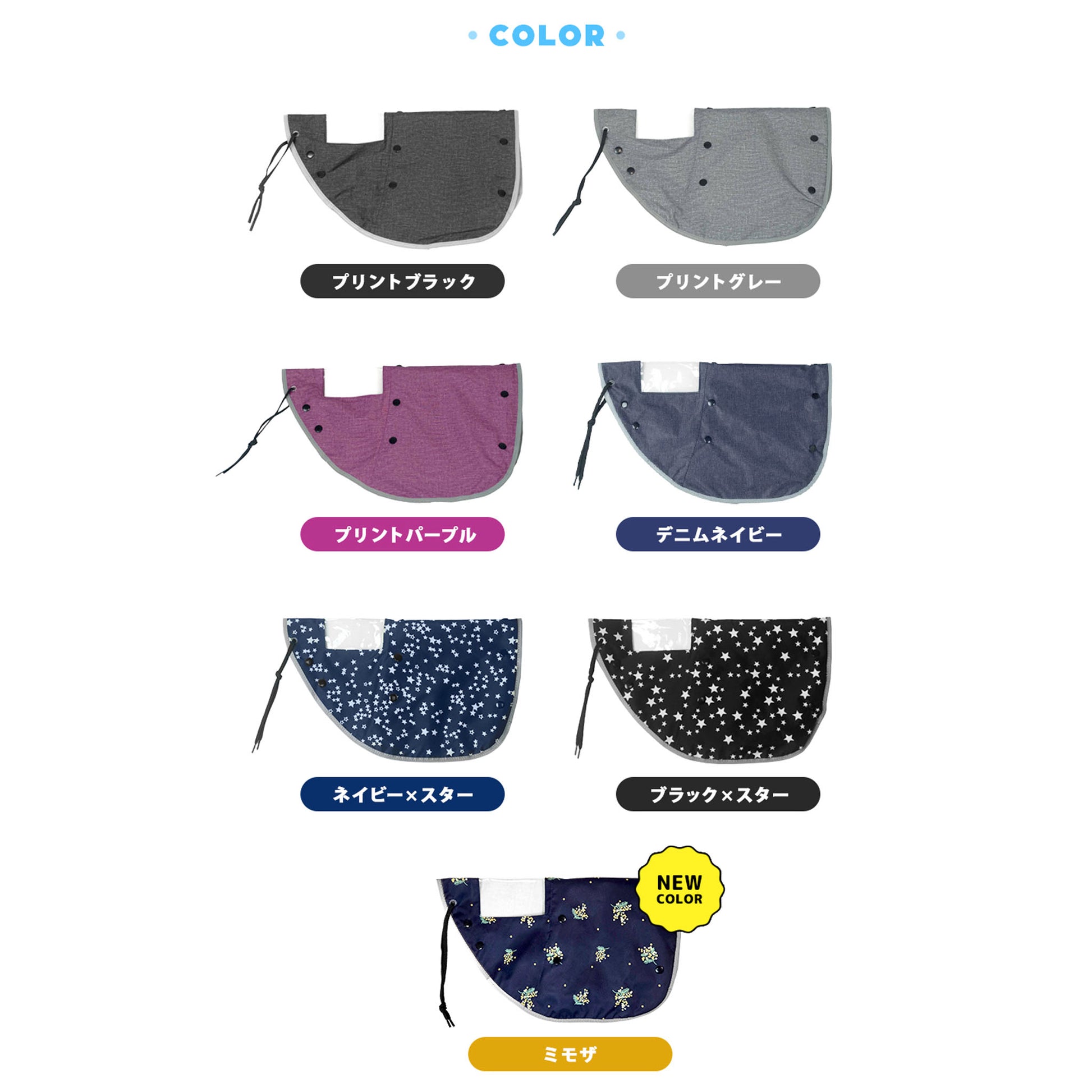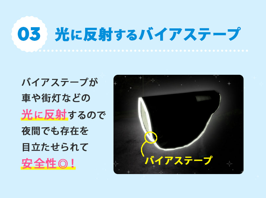 反射バイアステープ付きで、薄暗い雨の日や夜道でも車のライトを反射し、存在感をアピール出来て安心安全!