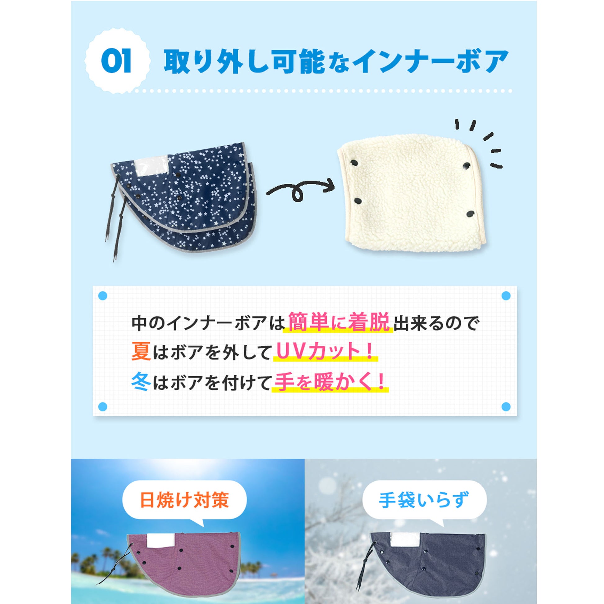 夏の暑い時期にはハンドルカバー内のボアを取り外し、真夏の太陽の紫外線防止&日焼け対策としても使えます◎。