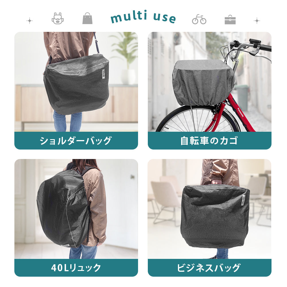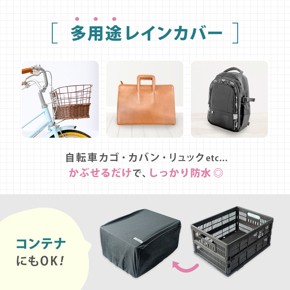 かぶせるだけのワンタッチ仕様で、自転車の前かごや後かごにさっと被せるだけで雨から荷物を守ります。